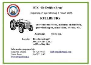 « Alle Veranstaltungen Ruilbeurs De Ewijkse Brug 07.03.2026 März 7 « Jahreshauptversammlung am 24.03.2026 um 19:30 Uhr Dornicker Oldtimertreffen am 18 April 2026 » OTC „de Ewijkse Brug“ https://ewijksebrug.nl/kalender Zum Kalender hinzufügen Google Kalender iCalendar Outlook 365 Outlook Live Details Datum: März 7